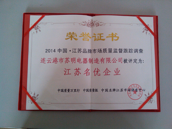 在2014年3.15到來之際,連云港市蘇明電器制造有限公司被中國.江蘇品牌市場質(zhì)量監(jiān)督跟蹤調(diào)查中心評為 “江蘇名優(yōu)企業(yè)”。